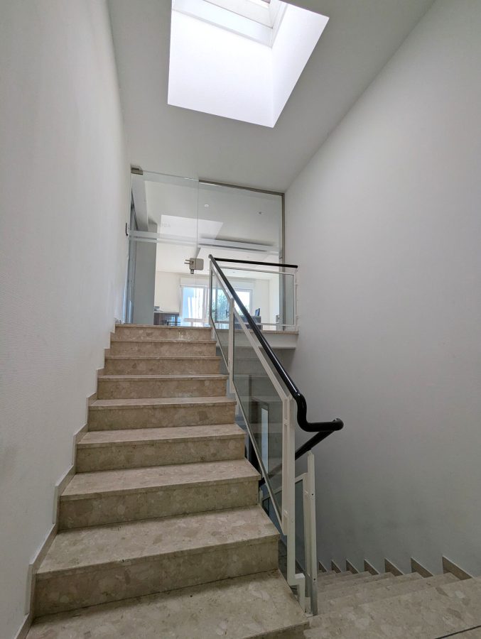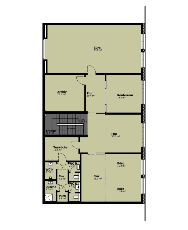 Über das zentrale Treppenhaus erreichen Sie die gesamte Etage. Bereits der großzügige Eingangsbereich eignet sich ideal für einen einladenden Empfangstresen und einen kleinen Wartebereich für Kunden.