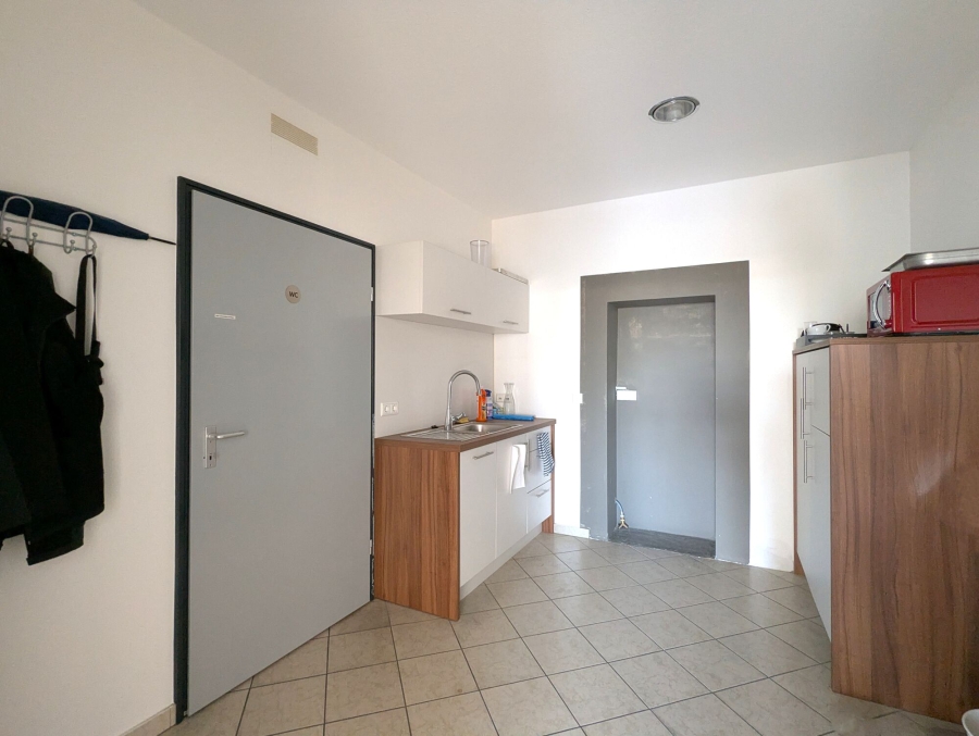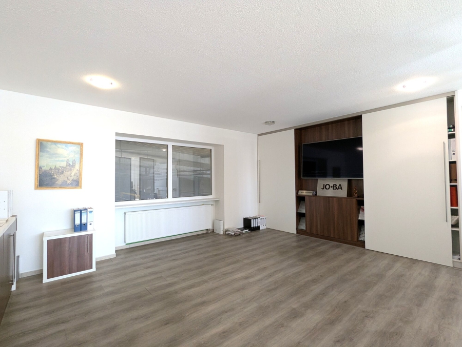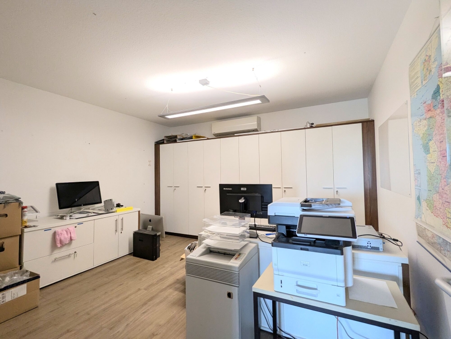 Ergänzt wird die Büroeinheit durch separate, zeitlos gestaltete Sanitäranlagen für Damen und Herren, die einen modernen und funktionalen Standard bieten. Zudem steht Ihnen eine Küche zur Verfügung – ideal für Pausen. Ein praktischer Lagerraum innerhalb der Einheit schafft zusätzlichen Stauraum für Materialien, Akten oder Technik.