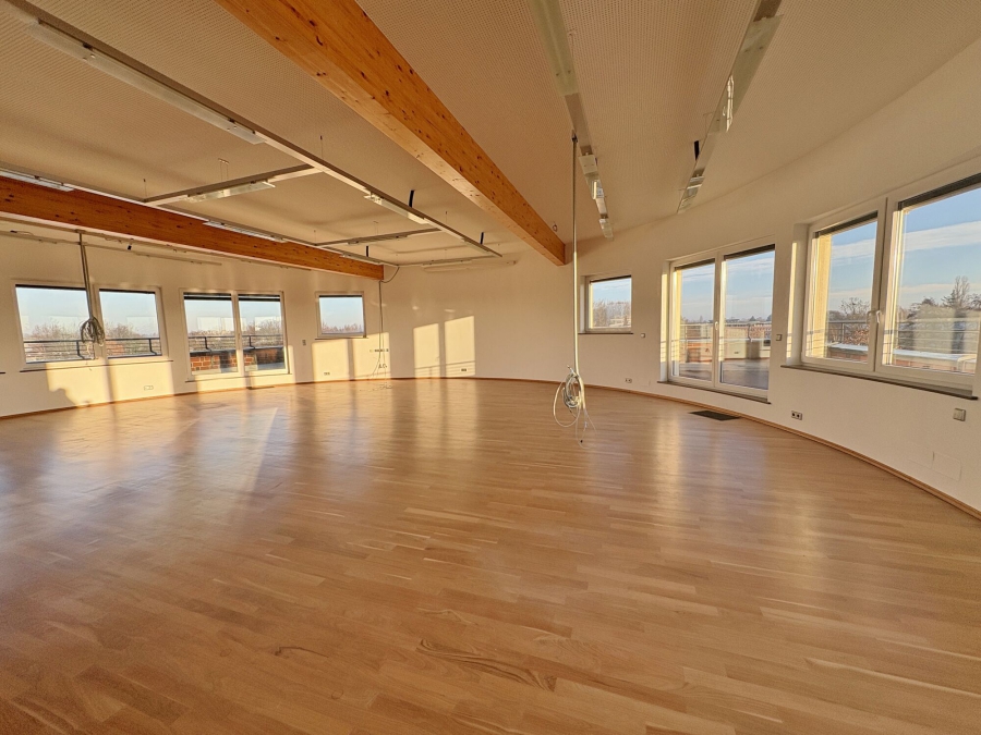 Der extravagante runde Schnitt des Raumes und die vielen bodentiefen Fenster zu den Dachterrassen lassen den Raum regelrecht erstrahlen. Von letzteren haben Sie einen tollen Blick über das Gewerbegebiet, welches im Sommer erstaunlich ergrünt. Für eine warme Atmosphäre sorgt der Parkettboden.