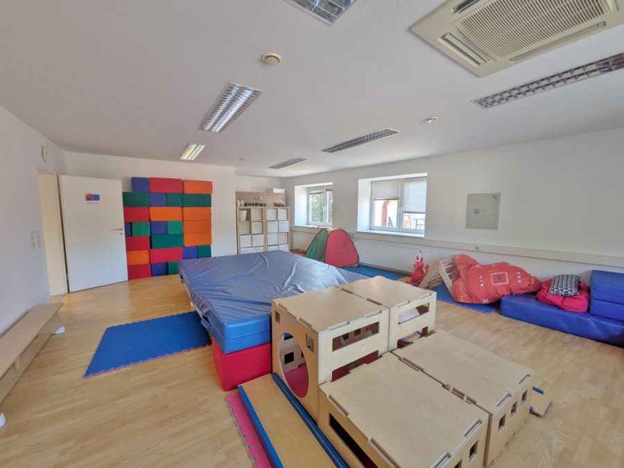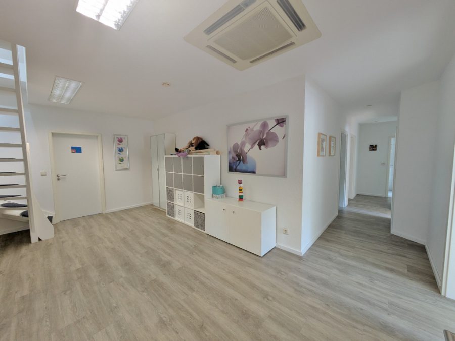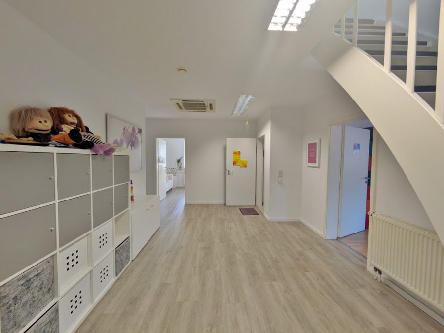 Ein separater Eingang führt Sie über eine breite Treppe direkt in das Obergeschoss, wo ein einladender, heller Empfangsbereich auf Sie wartet. Von hier aus gelangen Sie in alle weiteren Räumlichkeiten.