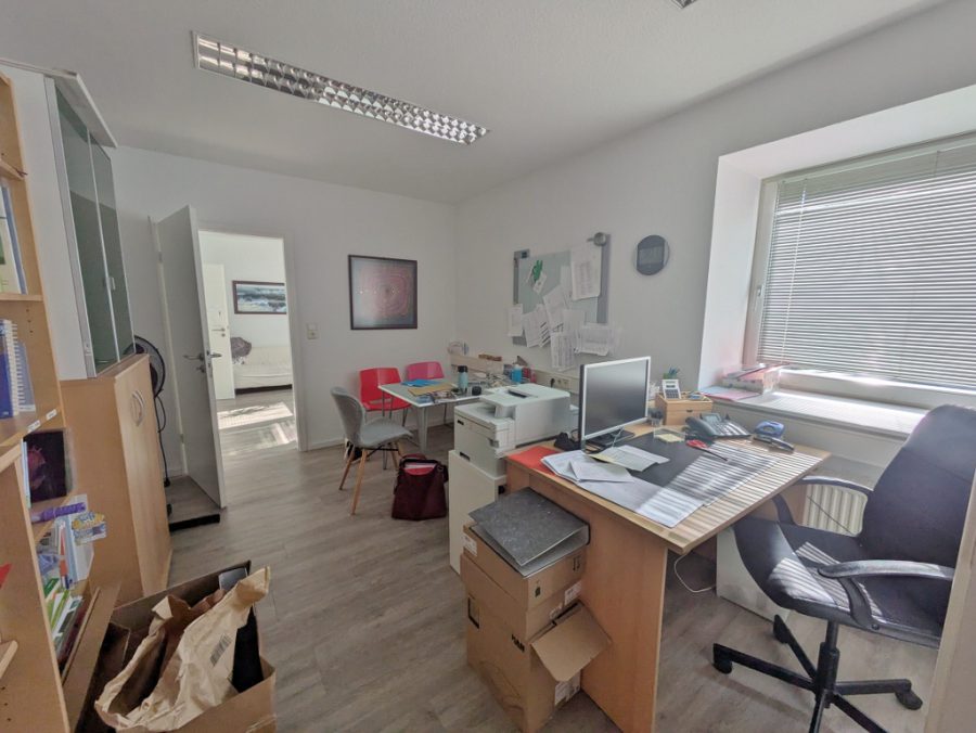 Das Highlight der Etage ist das ca. 43 m² große Großraumbüro, das mit edlem Parkettboden ausgestattet ist und Platz für drei bis vier großzügige Schreibtische bietet. Ein großer Tresor sorgt hier für zusätzliche Sicherheit. Vier weitere Büroräume, zwischen ca. 9 m² und 26 m² groß, sind mit einem stilvollen Vinylboden in Holzoptik versehen und bieten eine angenehme Arbeitsatmosphäre. Große Fensterfronten durchfluten die gesamte Etage mit natürlichem Licht.