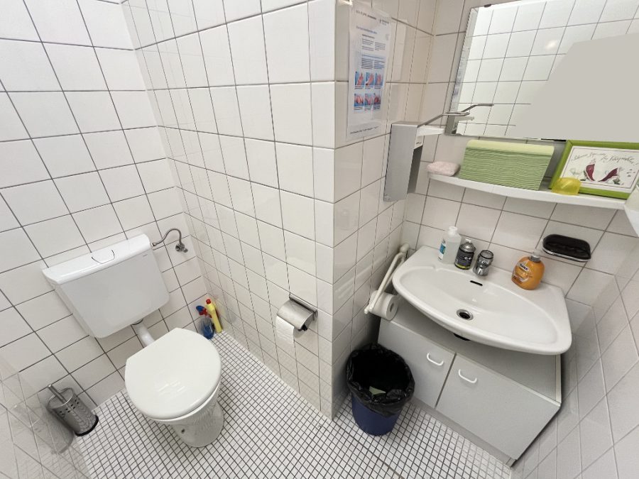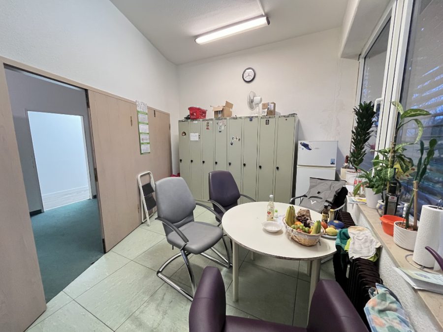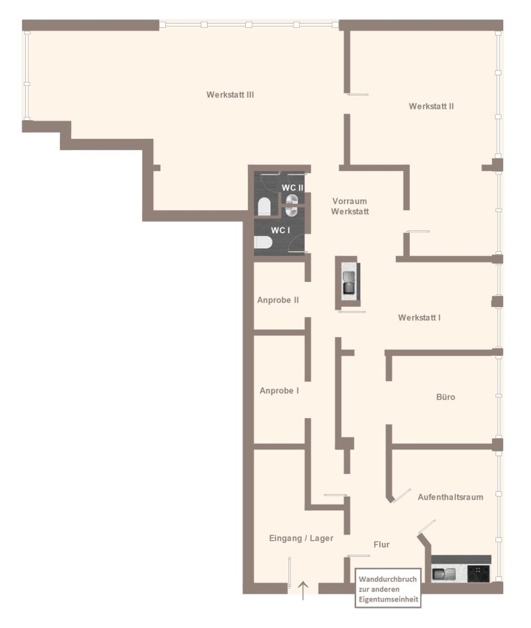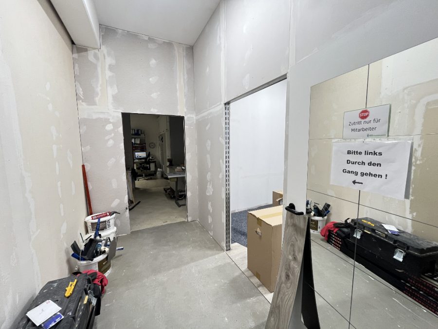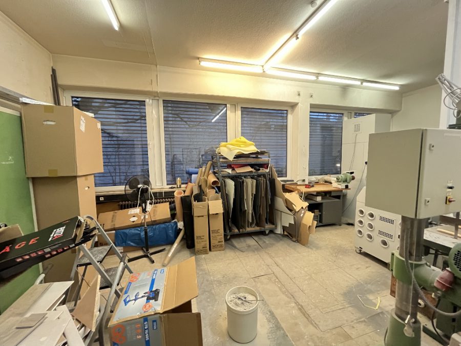 Der barrierefreie Zugang über den Haupteingang macht das Objekt besonders nutzerfreundlich. Die Einheit bietet ein vielfältiges Raumangebot: einen Lagerraum, einen Aufenthaltsraum mit Teeküche, ein Büro, zwei Anproberäume, zwei WCs und drei Werkstattbereiche. Letztere verfügen über die notwendigen technischen Anschlüsse wie Wasser, Starkstrom und Druckluft, die den Betrieb von Spezialgeräten ermöglichen.