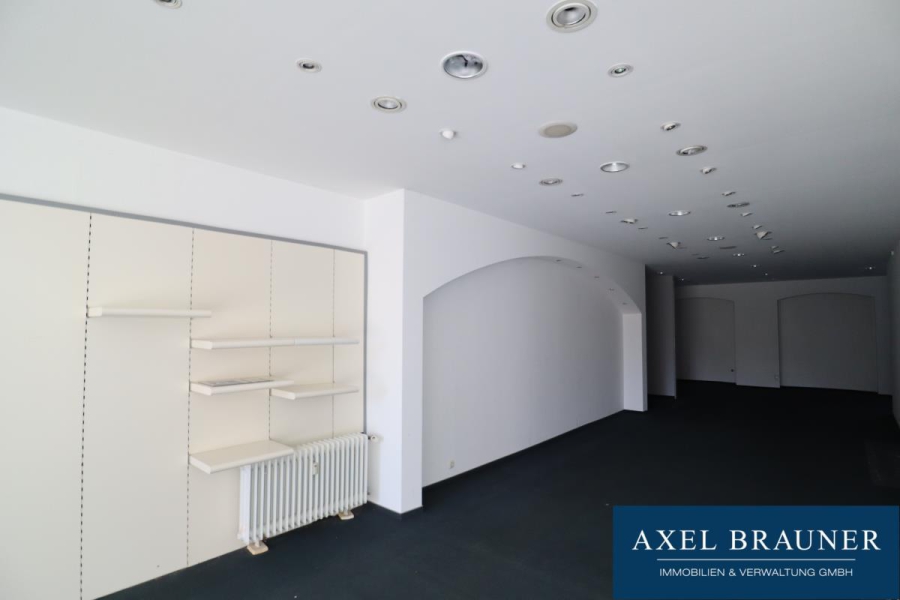 Der U-förmige Grundriß des Ladengeschäfts teilt sich auf in den vorderen, sehr hellen Verkaufsbereich, einen breiten seitlichen Gang und einer Präsentationsfläche im hinteren Bereich. Der offene Grundriss mit nur einer Säule bietet viel Flexibilität bei der Gestaltung und viele Nutzungsmöglichkeiten.