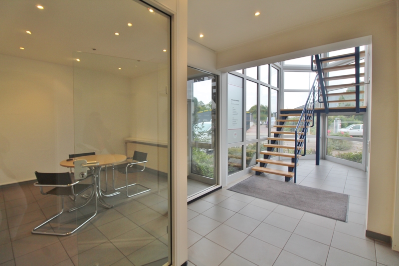 Der Zugang zum Haus erfolgt über ein gläsernes Treppenhaus, dem sich direkt ein Besprechungs-/Empfangsraum und Kunden-WCs anschließen. Es folgt ein großer Raum, welcher sich sowohl als Großraumbüro, als auch als Showroom ideal anbieten würde. Von diesem Raum gelangen Sie in die Lager- bzw. Produktionsfläche, die sich über insgesamt ca. 311 m² erstreckt.