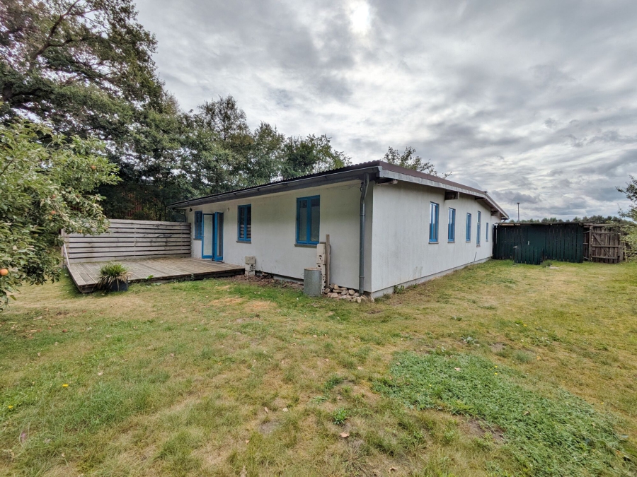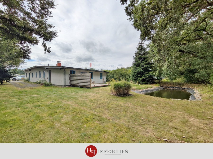 Der Außenbereich ist ebenso durchdacht gestaltet: Eine gepflegte Rasenfläche mit großem Teich ziert den rückwärtigen Garten, während die geschotterte Parkfläche im vorderen Bereich ausreichend Stellplätze für zahlreiche Fahrzeuge bietet.