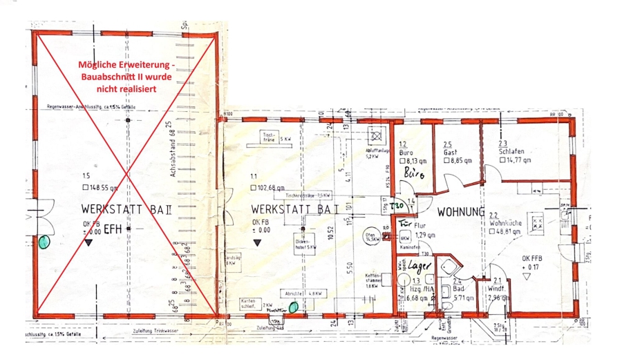 Das Gebäude beeindruckt durch seine moderne Holzrahmenbauweise mit einer eleganten Putzfassade und einem flach geneigten Satteldach, gedeckt mit hochwertigem, lackierten Stahl-Trapezblech. Die bestehende Werkstattfläche von ca. 102 m² lässt sich bei Bedarf um weitere 148 m² erweitern, da der zweite Bauabschnitt noch realisiert werden kann.