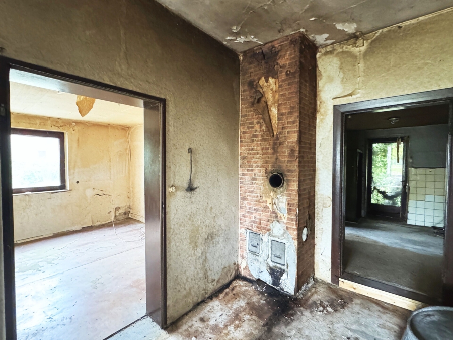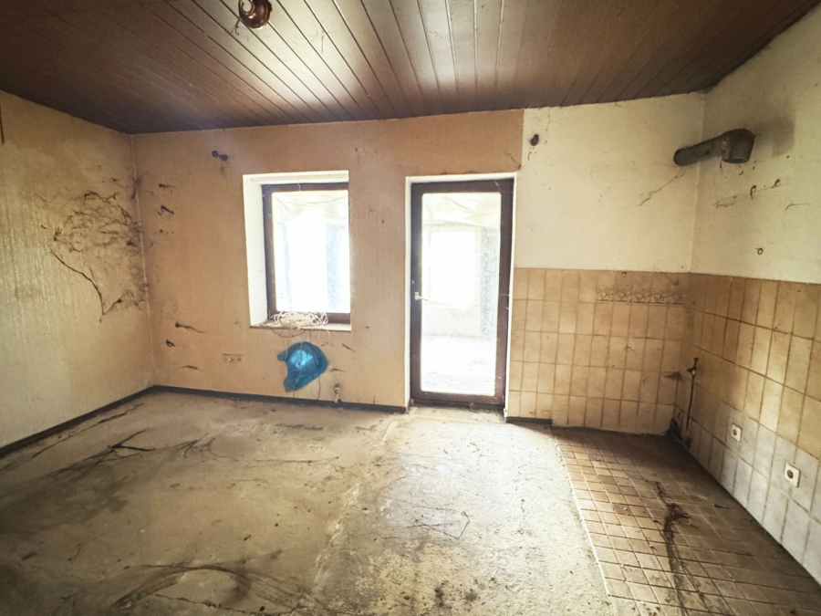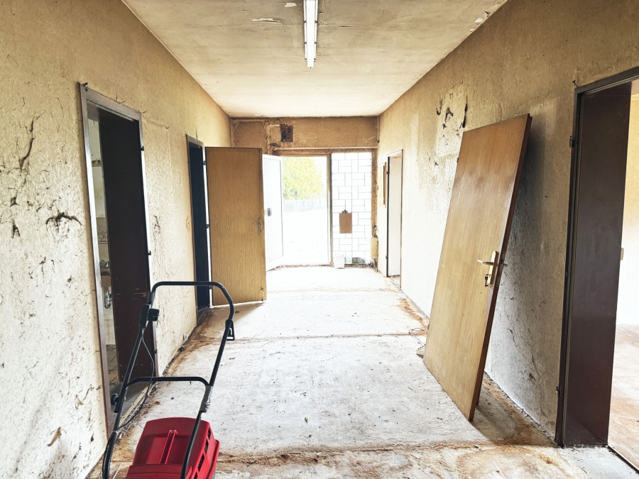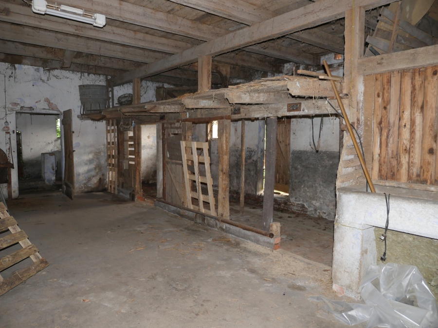 Der vorhandene Gebäudebestand ist stark sanierungsbedürftig: Die Ausstattung des ehem. Bauernhauses ist sehr einfach (Fenster, Fußböden, Badezimmer, keine Heizung). In einigen Bereichen ist aufsteigende Feuchtigkeit sichtbar. Im angrenzenden Stallgebäude befinden sind ehemalige Kuh- und Schweineställe. Im hinteren Bereich war früher eine Metallwerkstatt. Beide Dachböden wurden zur Heu- und Strohlagerung genutzt. Es liegt ein Kostenvoranschlag für die Abbrucharbeiten aller Gebäude vor; diesen stellen wir Ihnen gerne zur Verfügung.