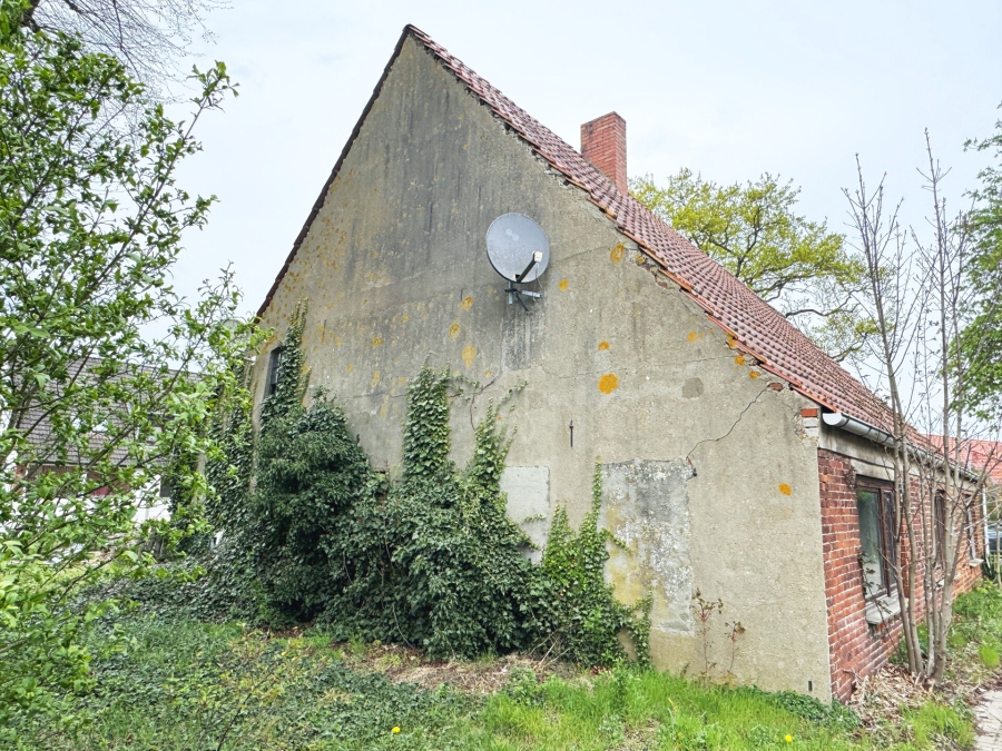 Alternativ ist auch eine Sanierung der kleinen Hofstelle denkbar. Das Wohnhaus ist in einem stark sanierungsbedürftigen Zustand, das Dachgeschoss ist nicht ausgebaut. Angrenzend befindet sich der Stall mit ehemaliger Werkstatt.