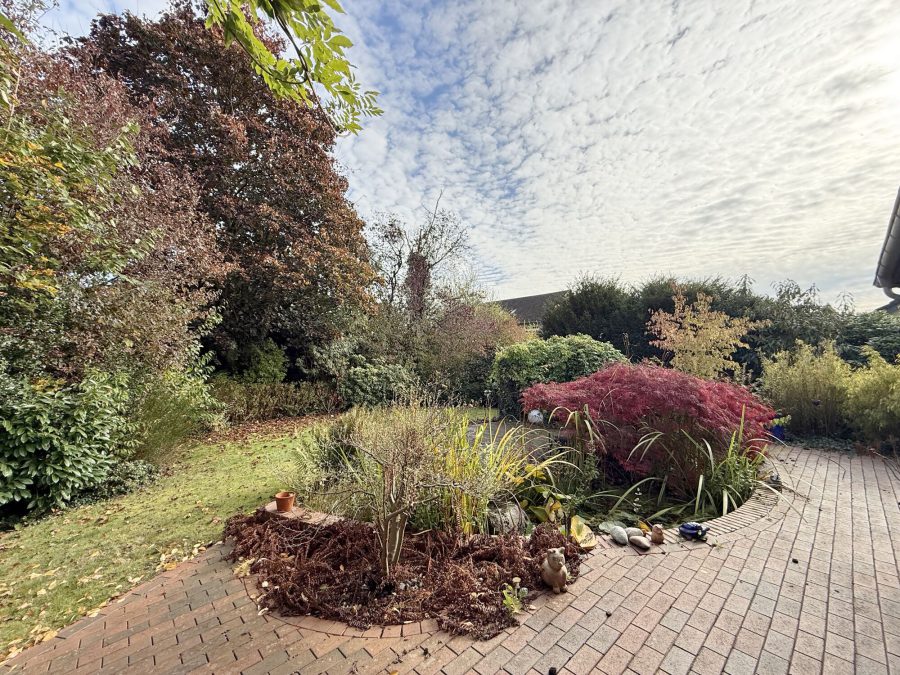 Der sonnige, uneinsehbare Garten ist liebevoll gestaltet und mit einem kleinen Teich versehen – perfekt zum Entspannen, Spielen und Genießen. Ein Carport bietet Platz für Ihr Fahrzeug. Die vorhandene Garage wurde zu einem Abstellraum/Schuppen umfunktioniert.
