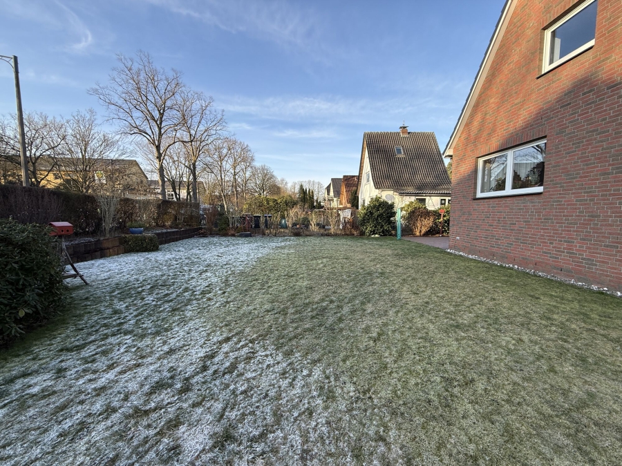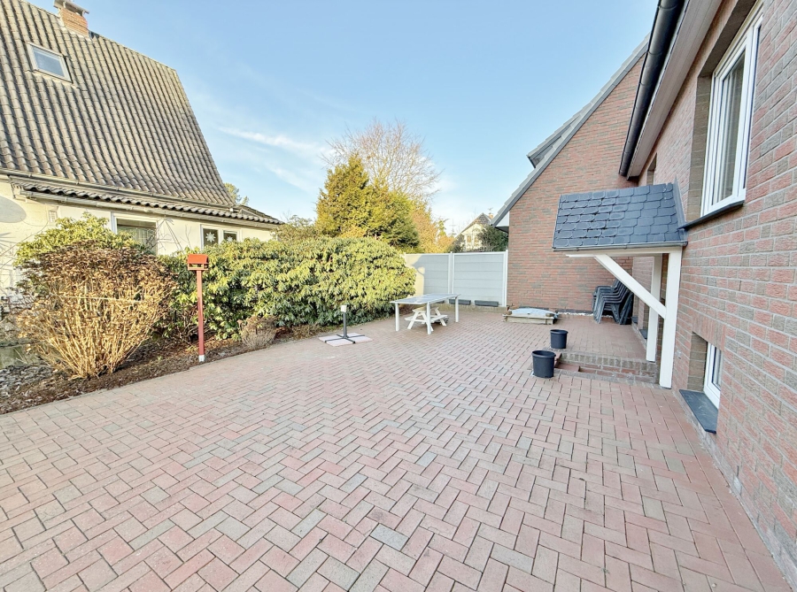 Im Außenbereich überzeugt die große Südwest-Terrasse als gut nutzbare Fläche für Sitzgruppen, Grill oder Sonnenliegen. Von hier öffnet sich der Blick in den Garten, der als Rasenfläche mit gewachsenem Grün vielseitige Möglichkeiten bietet, vom Spielen bis zum Gärtnern. Durch die Grundstücksgröße ist ausreichend Abstand und Bewegungsfläche vorhanden, ohne dass der Pflegeaufwand zwangsläufig ausufert.