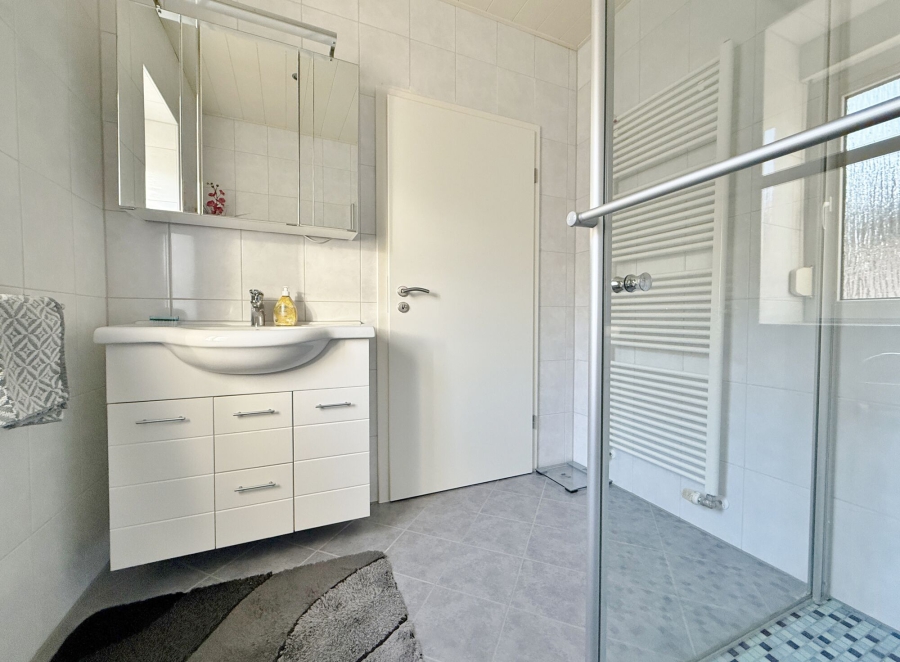 Ebenfalls im Erdgeschoss befindet sich ein modernisiertes Duschbad. Die Ausstattung wirkt zeitgemäß und gepflegt, mit großformatigen, hellen Wandfliesen, einer bodennahen Dusche mit Glasabtrennung sowie einem Fenster für Tageslicht und Lüftung. Damit ist das Bad alltagstauglich positioniert, etwa für Gäste oder als praktische Ergänzung zum Familienleben.