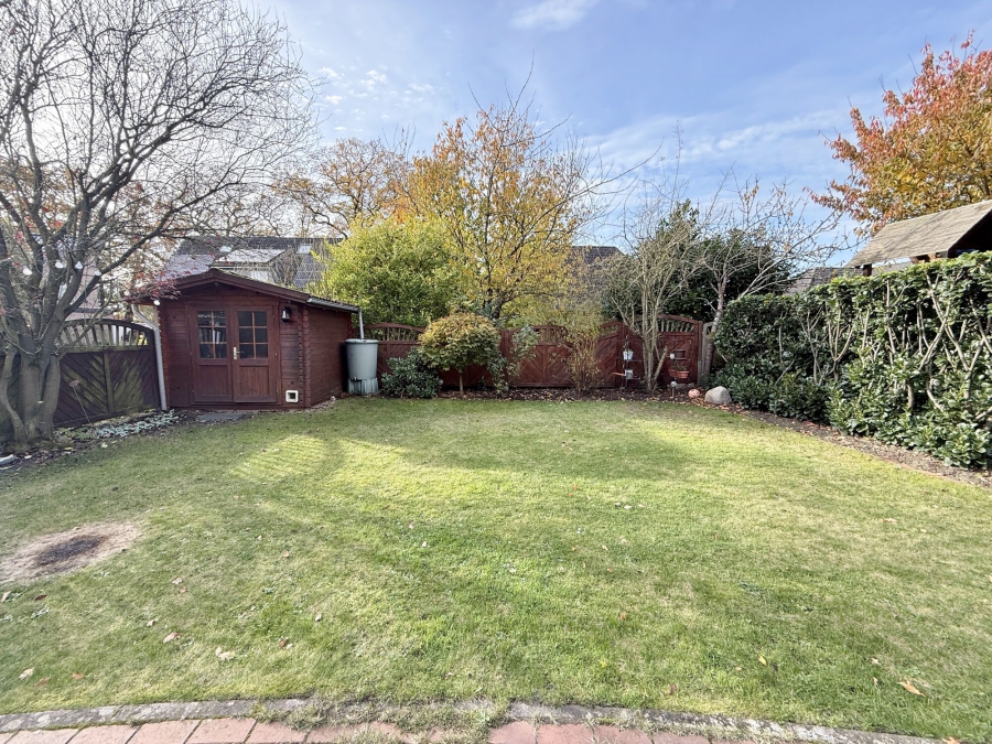 Die Terrasse bietet ausreichend Platz für entspannte Abende mit Familie und Freunden. An warmen Sommertagen sorgt eine elektrische Markise für angenehmen Schatten. Der Garten ist vollständig eingezäunt, pflegeleicht angelegt und durch Büsche und Sträucher rund ums Haus gut geschützt – ideal für Privatsphäre und spielende Kinder.
