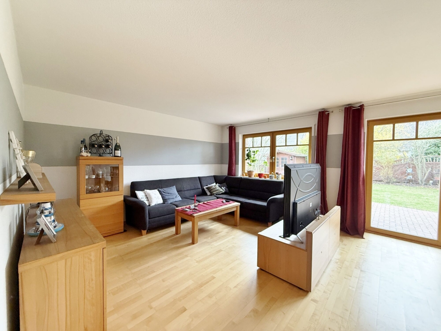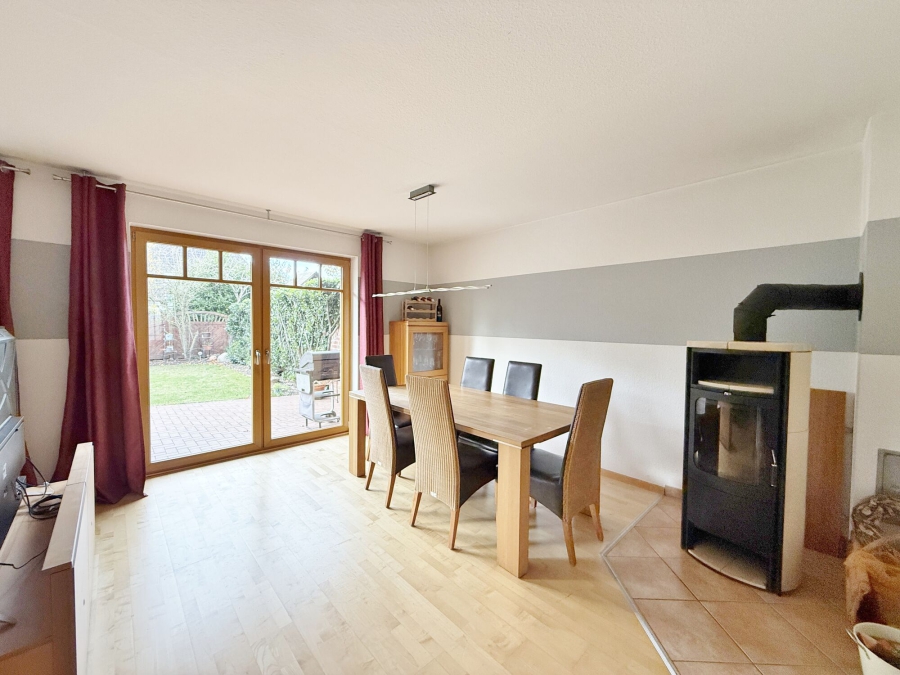 Das großzügige Wohn- und Esszimmer erstreckt sich über die gesamte Hausbreite. Bodentiefe Fenster sorgen für eine freundliche, lichtdurchflutete Atmosphäre und geben den Blick auf Terrasse und Garten frei. Eine gemütliche Sofalandschaft sowie ein großer Esstisch finden hier problemlos ihren Platz. Der Kaminofen schafft an kühlen Tagen zusätzliche Behaglichkeit. Von diesem Bereich aus erreichen Sie die offene, einladende Terrasse im sichtgeschützten Garten.