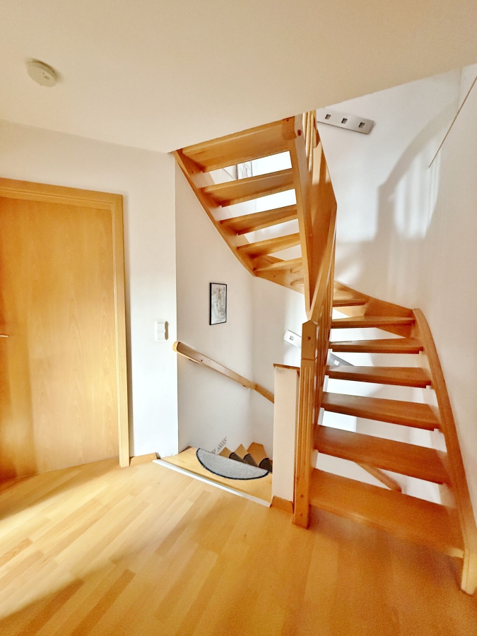 Über eine massive Treppe mit Buchenstufen gelangen Sie ins Obergeschoss.