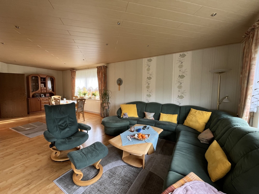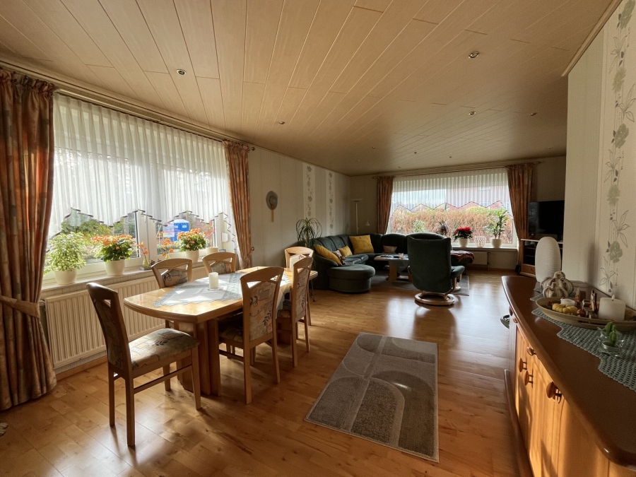 Der Mittelpunkt des Erdgeschosses ist das große Wohn- und Esszimmer mit seinen breiten Fensterfronten zum Garten. Hier genießen Sie den ganzen Tag viel Licht und einen schönen Blick ins Grün. Der gepflegte Holzboden und die warme Holzdecke sorgen für eine behagliche Atmosphäre, in der sich Wohn- und Essbereich perfekt kombinieren lassen.