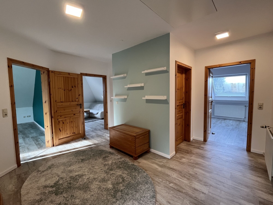 Im ausgebauten Dachgeschoss setzt sich der positive Eindruck nahtlos fort: Ein heller Flur erschließt mehrere gut geschnittene Zimmer, die sich flexibel als Schlaf-, Kinder-, Gäste- oder Arbeitszimmer nutzen lassen. Die modernen Bodenbeläge, das freundliche Farbkonzept und die großen Fenster bzw. Dachflächenfenster schaffen ein zeitgemäßes Wohnambiente. Ein weiteres, vollständig ausgestattetes Tageslichtbad mit Wanne und Dusche macht das Dachgeschoss fast zu einer eigenen Wohnetage – ideal für größere Kinder.