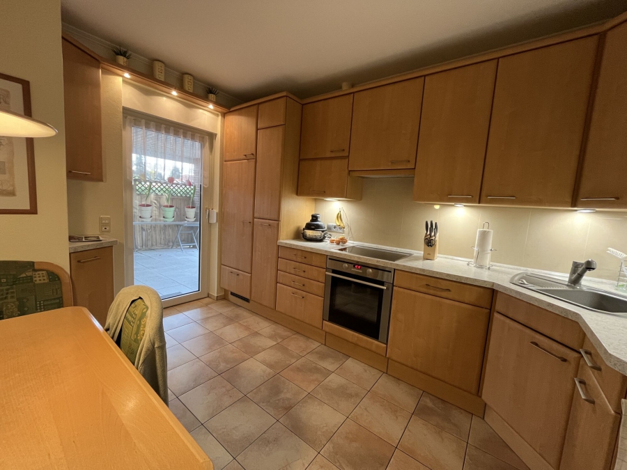 Angrenzend befindet sich die gemütliche Wohnküche mit umfangreicher Einbauküche und viel Stauraum. Von hier gelangen Sie direkt auf die Terrasse – ideal für den schnellen Kaffee zwischendurch oder den Grillabend im Sommer.