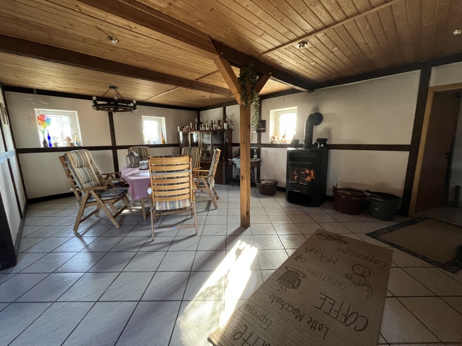Besonders reizvoll ist das umfangreiche Platzangebot im Außen- und Nebengebäudebereich. Ein riesiger Carport schafft reichlich Unterstellmöglichkeiten für Fahrzeuge, Anhänger oder Geräte. Hinzu kommen ein Partyraum mit Ofen, eine Werkstatt sowie weitere praktische Nutzflächen, die ideale Voraussetzungen für Hobbys, Lagerung, handwerkliche Arbeiten oder gesellige Abende bieten. Diese Kombination macht den besonderen Wert der Immobilie aus und hebt das Objekt deutlich von gewöhnlichen Wohnimmobilien ab.