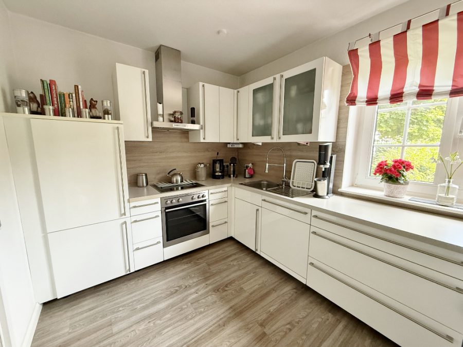 Die seitlich gelegene Küche ist mit einer Einbauküche ausgestattet und bietet Platz für einen kleinen Essbereich. Direkt angrenzend befindet sich der Hauswirtschaftsraum mit Waschmaschinenanschluss und praktischem Zugang zum Garten.