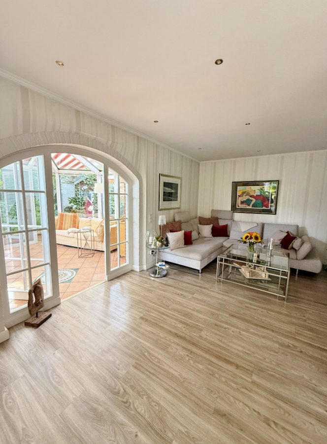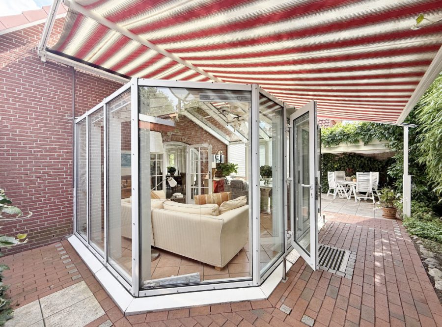 Vom Wohnbereich aus betreten Sie den gefliesten, mit Fußbodenheizung ausgestatteten Wintergarten. Jalousien und eine elektrische Markise sorgen hier für angenehmes Licht und ein ideales Raumklima. Von hier aus genießen Sie den Blick in den uneinsehbaren Garten – und gelangen direkt auf die Terrasse.