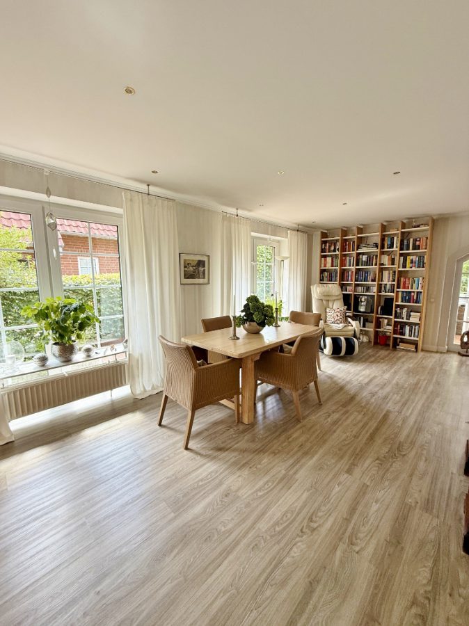 Das L-förmig gestaltete Wohn- und Esszimmer schafft eine klare Trennung zwischen den Bereichen. Der Essplatz bietet Raum für gesellige Runden, während im Wohnbereich der Kamin für wohlige Wärme sorgt.