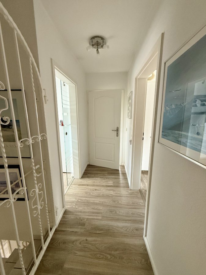 Beim Betreten des Hauses werden Sie von einem hellen, großzügigen Flur empfangen. Die offene Treppe ins Obergeschoss und eine durchdachte Raumaufteilung verleihen dem Eingangsbereich eine einladende Atmosphäre. Küche, Wohn- und Esszimmer sowie das modernisierte Gäste-WC sind von hier bequem erreichbar.