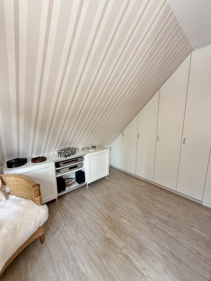 Über die massive Treppe erreichen Sie das Obergeschoss mit einem Kinderzimmer, einem Elternschlafzimmer mit integriertem Ankleidebereich sowie einem Arbeits- oder Gästezimmer. Trotz der Dachschrägen lassen sich alle Räume gut möblieren.