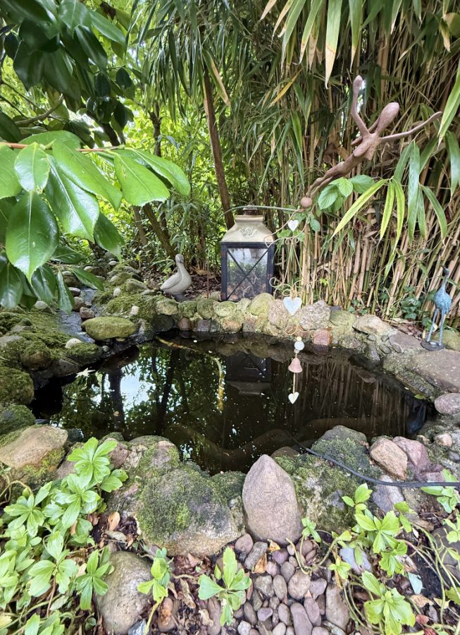Der liebevoll angelegte Garten ist rundum eingewachsen und bietet dank dichter Bepflanzung und stilvollem Teich absolute Privatsphäre.