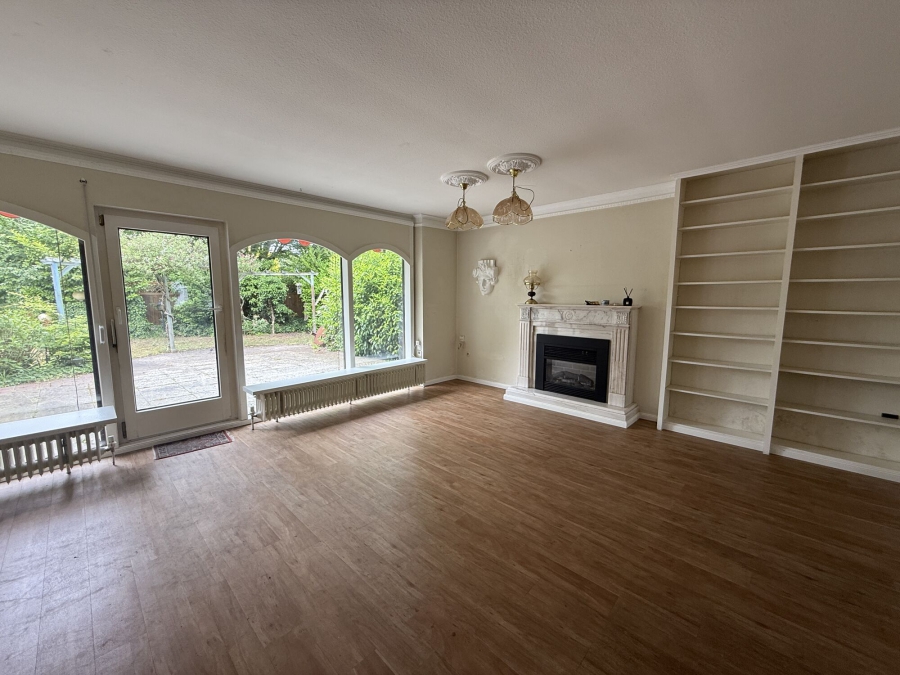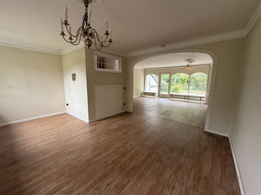 Das Wohnzimmer ist mit einer breiten, bodentiefen Fensterfront ausgestattet, die den Raum mit viel Licht durchflutet. Von hier aus können Sie die geschützte Terrasse im Westen betreten – der perfekte Ort, um den wohl verdienten Feierabend zu genießen. Da am Wohnzimmer direkt das ursprüngliche Elternschlafzimmer angrenzt, wurde die Wand geöffnet und es entstand ein zusätzliches Esszimmer.