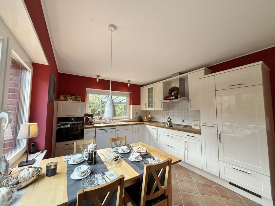 Von der anschließenden Diele erreichen Sie sowohl die Küche als auch den Wohn- und Essbereich. Die moderne Einbauküche lädt zu geselligen Kochabenden mit Familie und Freunden ein. Ein gemütlicher Essplatz vor dem Fenster bietet den perfekten Start in den Tag.