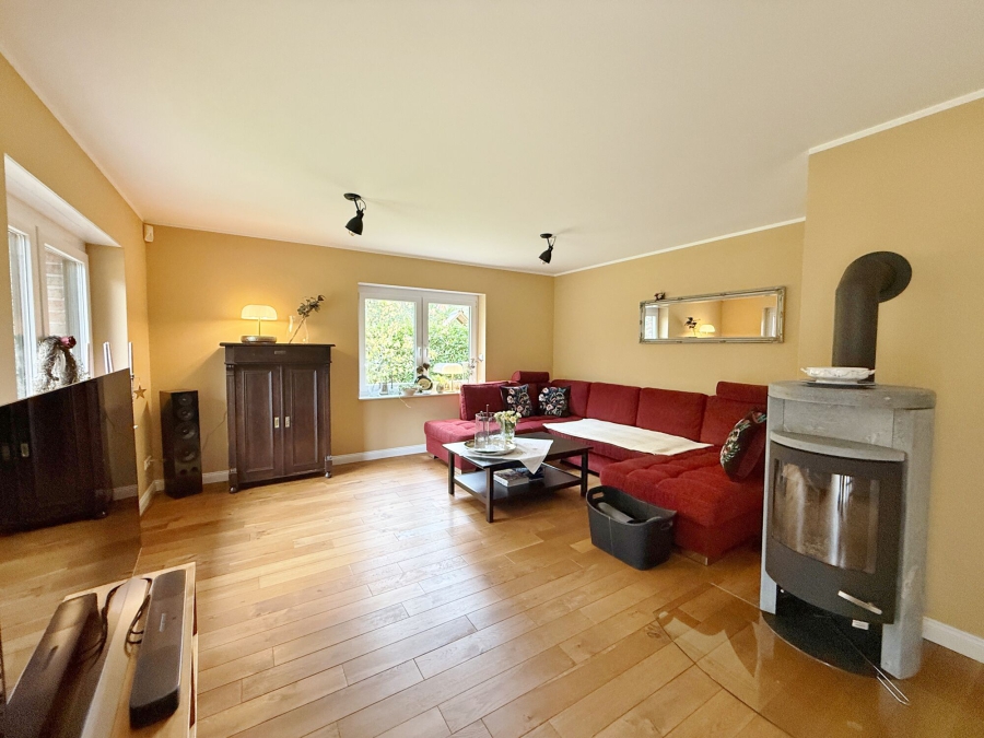 An kühleren Tagen sorgt der Kaminofen mit Außenzuluft für wohlige Wärme und eine behagliche Atmosphäre. Große Fensterflächen eröffnen den Blick in den liebevoll angelegten Garten.