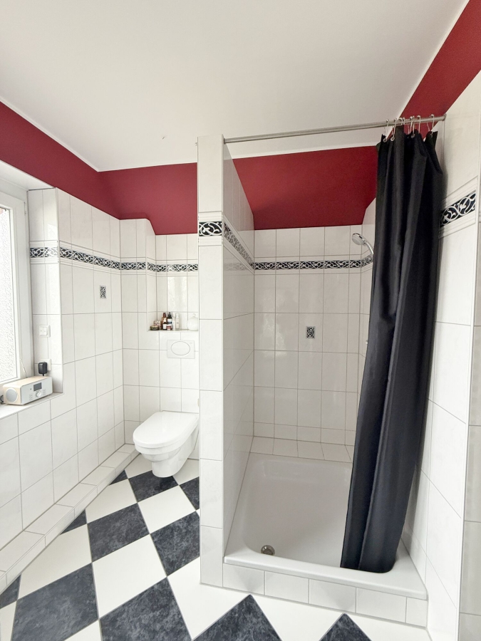 Das stilvolle Vollbad präsentiert sich in zeitloser Eleganz: helle Wandfliesen, kontrastierende Bodenfliesen, eine Eckbadewanne und eine separate Dusche sorgen für modernen Komfort.