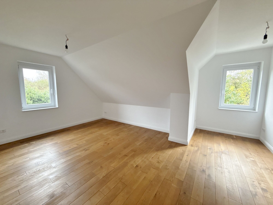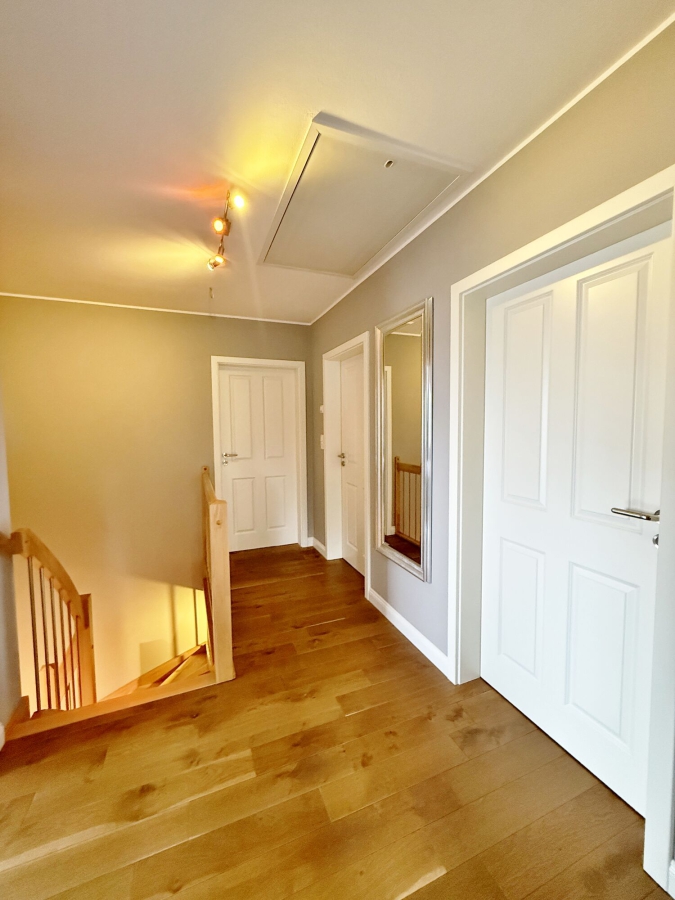 Über eine offene Vollholztreppe aus Buche gelangen Sie ins Obergeschoss. Hier erwarten Sie zwei fast identisch große Kinderzimmer sowie ein weiteres Gäste- oder Arbeitszimmer.