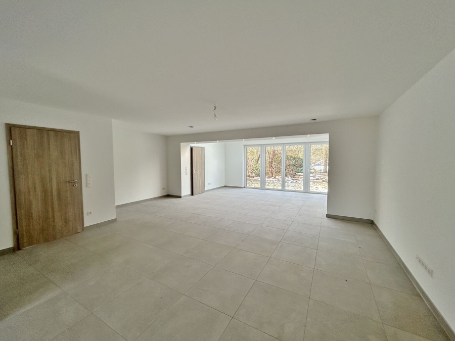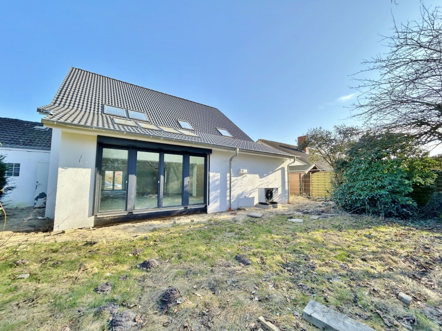 Der Wohn-/ und Essbereich wird durch die ehemalige Außenmauer etwas geteilt und bietet grenzenlose Gestaltungsmöglichkeiten. Der neue Anbau verfügt als besonderen Hingucker über Spots im Träger, sowie Glaselemente im Dach, die das Maximum an Licht ermöglichen. Von hier aus haben Sie Zugang zur rückwärtigen Terrasse mit West-Ausrichtung. Der Garten wird vor Einzug neu angelegt und grenzt an das Biotop, wodurch Sie einen wunderschönen Ausblick ins Grüne haben. Ein kleines Plus für Apfelkuchen-Fans: im Garten haben Sie Ihren eigenen Apfelbaum.