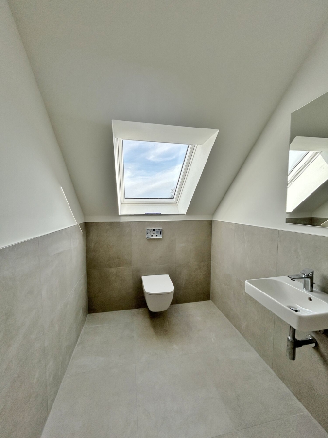 Das WC ist im Obergeschoss separat vom Badezimmer angelegt, wodurch Sie morgens viel Zeit sparen können. Im Badezimmer finden sich Badewanne, ebenerdige Dusche, ein Doppelwaschbecken und ein Handtuchheizkörper wieder, hier wurde an alles gedacht. Zudem ist hier einer der beiden Waschmaschinenanschlüsse vorgesehen, den anderen finden Sie im Heizungsraum.