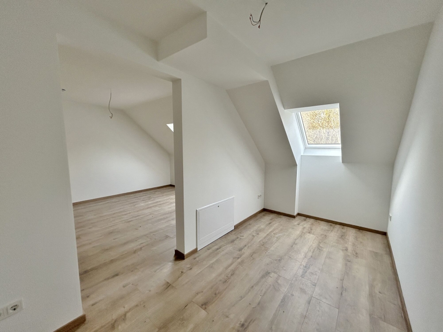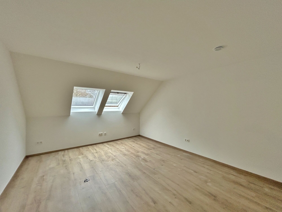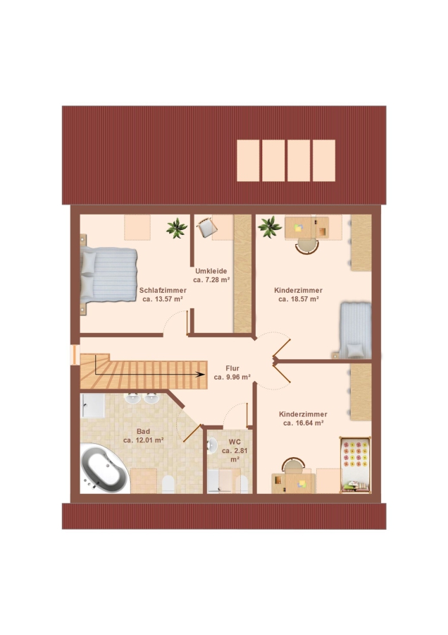 Auch das Obergeschoss kann sich sehen lassen. Das Elternschlafzimmer teilt sich auf in einen Schlafbereich und, etwas abgeteilt, einen Ankleidebereich, in dem alle Klamotten ihren Platz finden. Darüber hinaus im Obergeschoss gelegen sind die beiden Kinderzimmer, welche ebenfalls über eine sehr reelle Größe verfügen und sich daher auch mit Schrägen gut möblieren lassen.