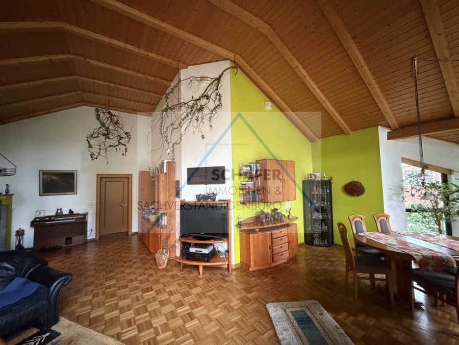 Im Erdgeschoss erwartet Sie ein sehr großzügiges Wohn- und Esszimmer mit Kaminofen und Zugang zur überdachten Terrasse, eine Küche mit Einbauküche, ein Schlafzimmer, ein Bad mit Dusche und Eckbadewanne, ein Gäste-WC, ein Abstellraum und ein Hauswirtschaftsraum mit direktem Zugang zur Garage und zum Garten.