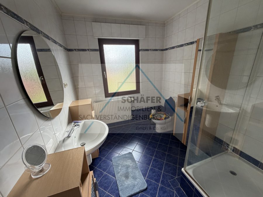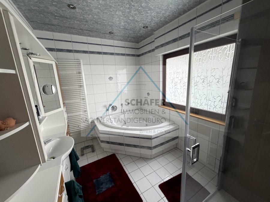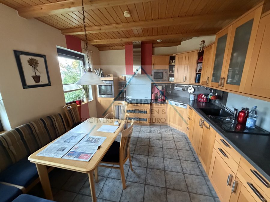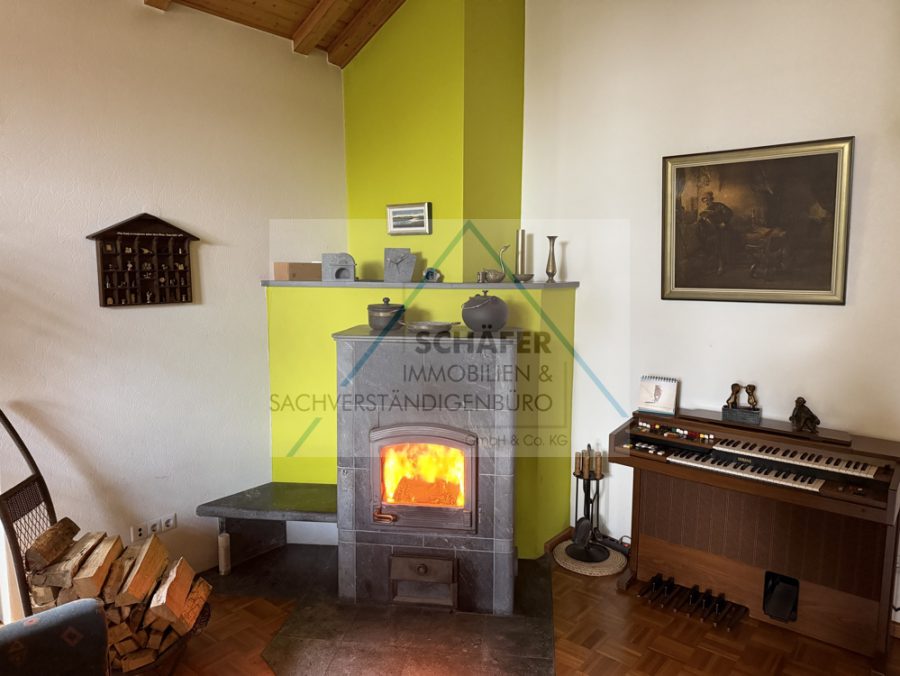 Im Erdgeschoss erwartet Sie ein sehr großzügiges Wohn- und Esszimmer mit Kaminofen und Zugang zur überdachten Terrasse, eine Küche mit Einbauküche, ein Schlafzimmer, ein Bad mit Dusche und Eckbadewanne, ein Gäste-WC, ein Abstellraum und ein Hauswirtschaftsraum mit direktem Zugang zur Garage und zum Garten.