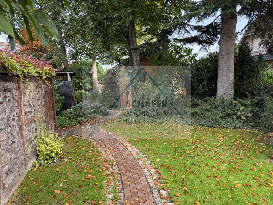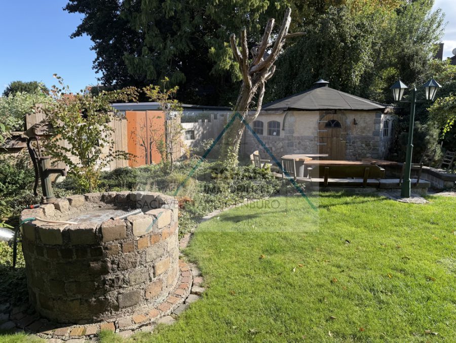 Das Grundstück beeindruckt mit einem großen, gepflegten Garten, einem schönen Gartenteich und einem gemütlichen Gartenhäuschen mit einer Terrasse.