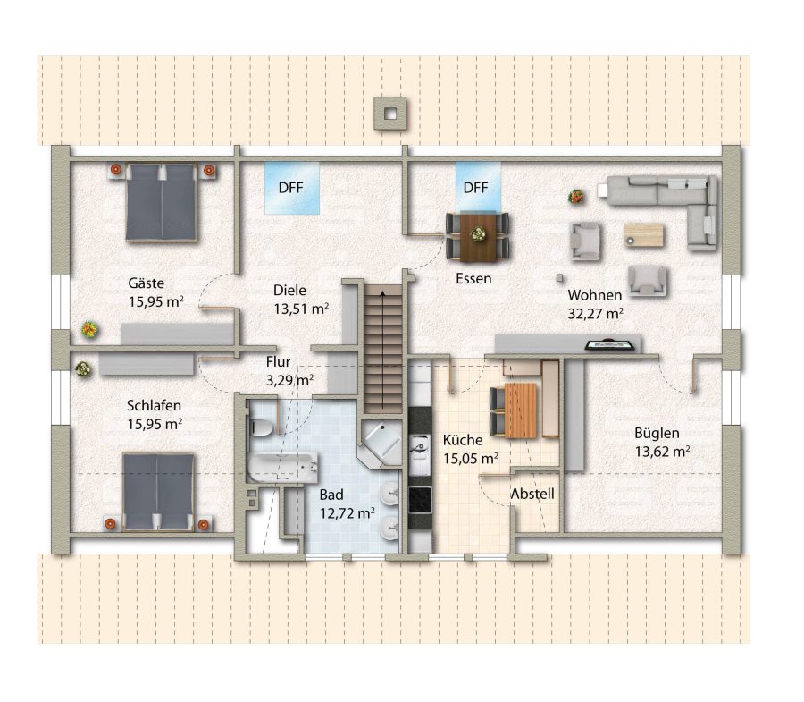 Im Dachgeschoss bietet ein geräumiges Wohn-Esszimmer, eine Küche, ein Badezimmer, sowie drei Schlafzimmer Platz für die Familie.