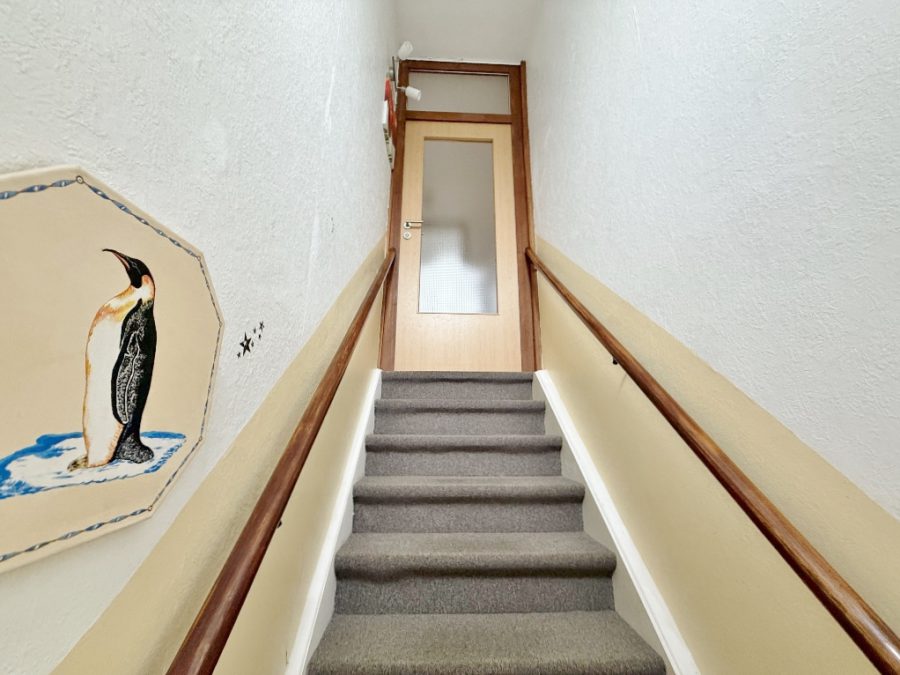 Über einen separaten Nebeneingang gelangen Sie in einen großen Windfang mit Zugang in die obere Etage, wo sich eine attraktive und großzügige ca. 77 m² große Drei-Zimmerwohnung befindet.