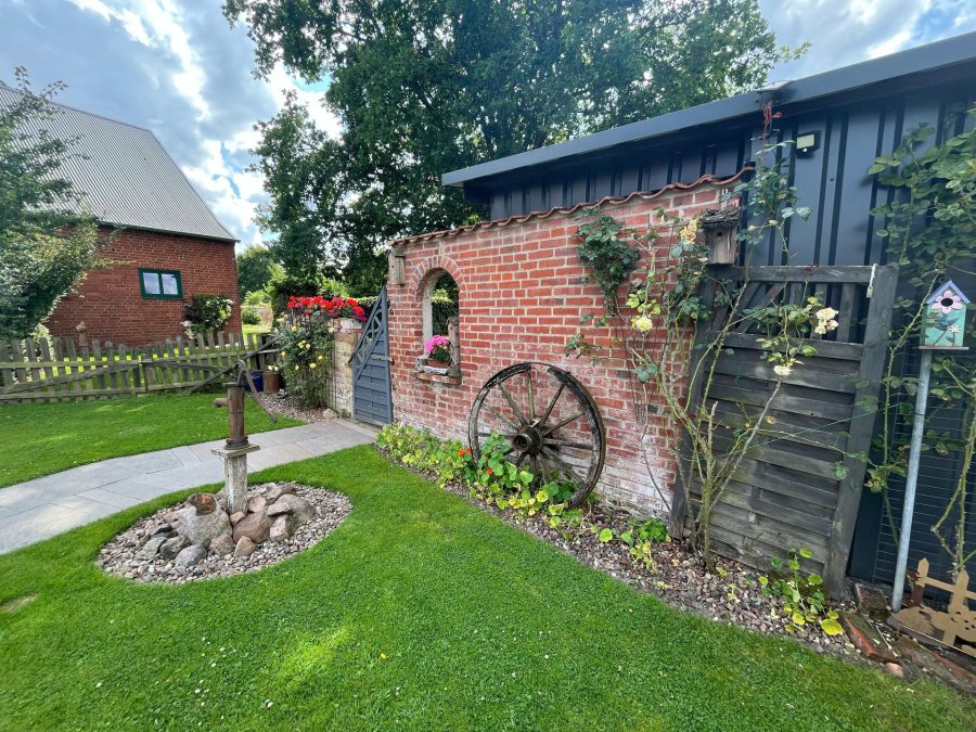 Der Bungalow liegt leicht erhöht im hinteren Bereich des Hofgrundstücks. Er bietet einen herrlichen und unverbauten Blick in die Natur. Direkt am Hauseingang befindet sich eine großzügige und gepflasterte Terrasse mit Markise und Brunnen - ideal für entspannte Stunden im Freien. Eine weitere Terrasse befindet sich angrenzend an den Wintergarten und wird von einem stilvoll angelegten Beet mit Feldsteinen eingefasst. Ein doppelt gepflasterter Weg führt rund um den Bungalow – eine praktische Verbindung zwischen Haus und Grundstück. Der Garten ist vielfältig bepflanzt und geschmackvoll gestaltet: Ein alter Kirschbaum, eine stattliche Lärche, Rhododendren und eine Vielfalt von weiteren Bäumen und Sträuchern verleihen dem Grundstück einen besonderen Charakter. Eine dichte Hainbuchenhecke rahmt den Garten des Bungalows ein und bietet Sichtschutz.