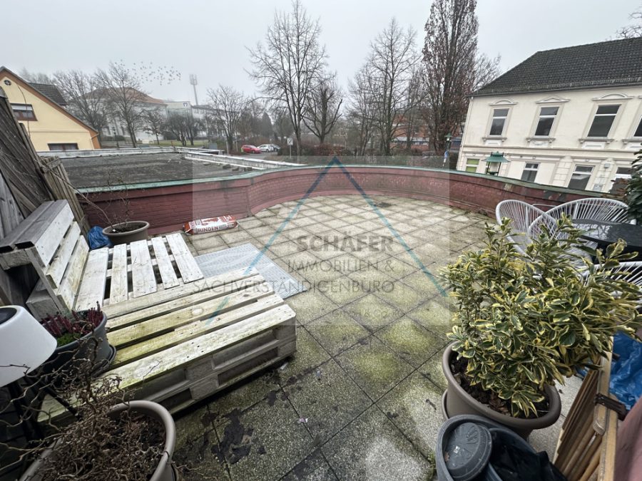 Die Wohnung ist über einen separaten Eingang zu begehen und hier befinden sich zwei Schlafzimmer, ein großes Wohnzimmer mit Zugang zur Dachterrasse, eine Küche ebenfalls mit Zugang zur Dachterrasse, ein Bad mit Wanne und Dusche, ein Gäste-WC und ein Abstellraum.