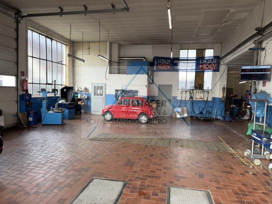 Werkstatt, Werkstattgrube, Reifenlager, Lager, Personalraum, WC, PKW-Stellplätze