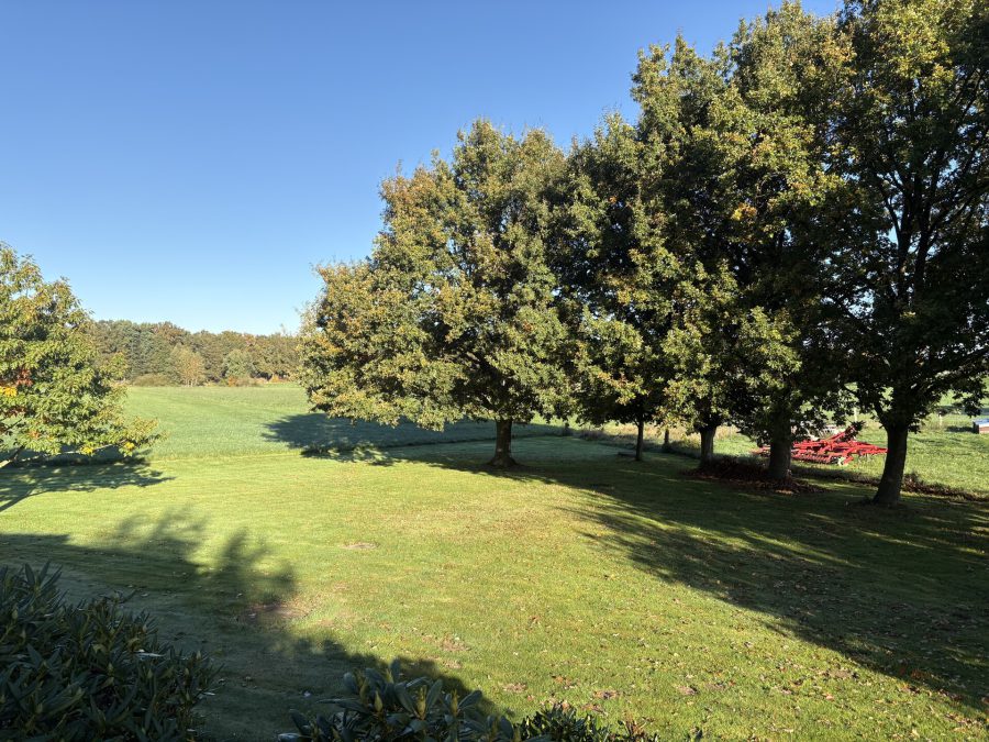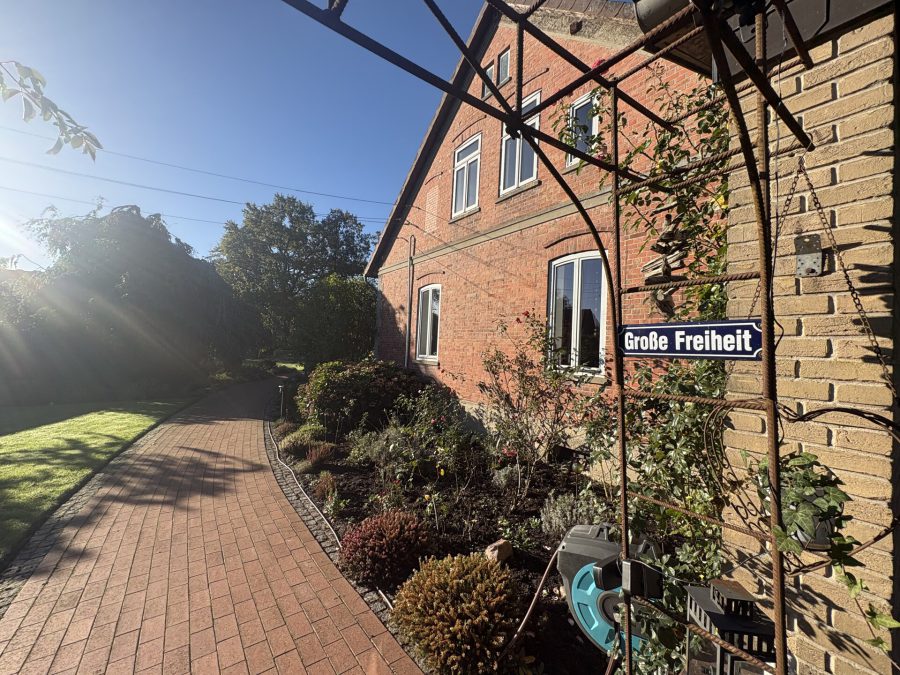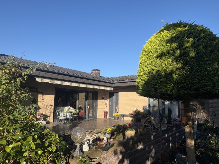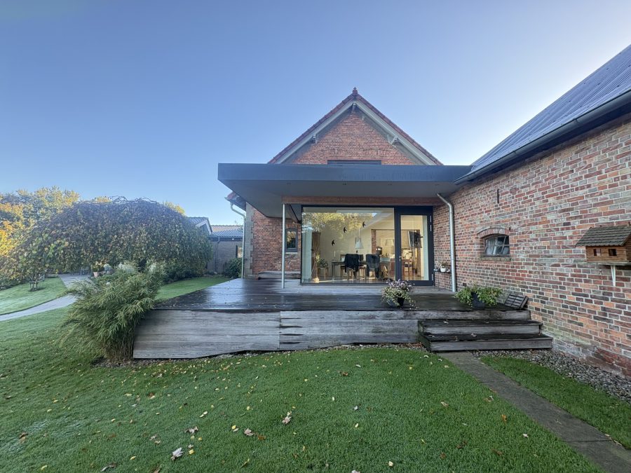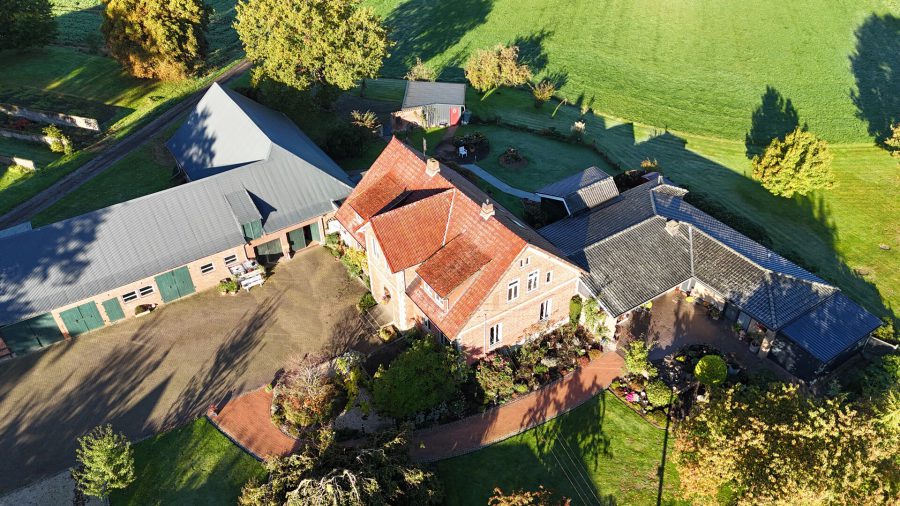 Das Landhaus befindet sich zentral auf dem Hofgrundstück. Mehrere mächtige, alte Eichen prägen den Hofcharakter. Der Bungalow liegt leicht erhöht im hinteren Bereich des Hofgrundstücks und bietet ein Gefühl von Weite und Privatsphäre. Auf dem gesamten Grundstück zeigt sich die Liebe zum Detail.