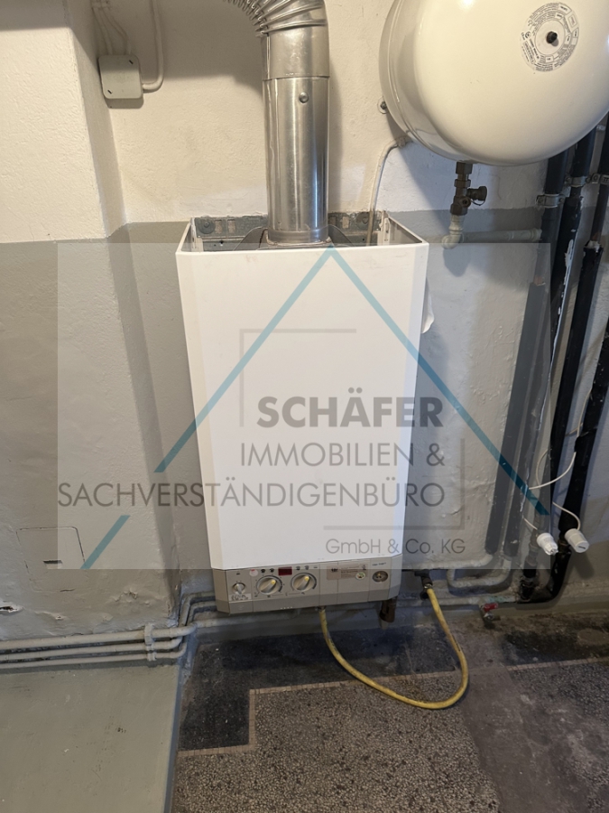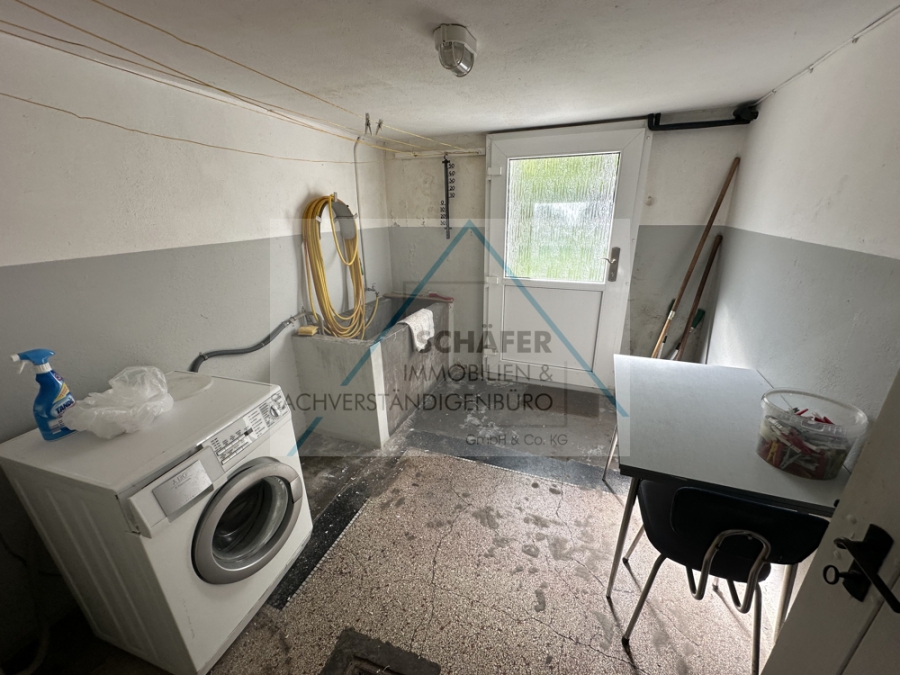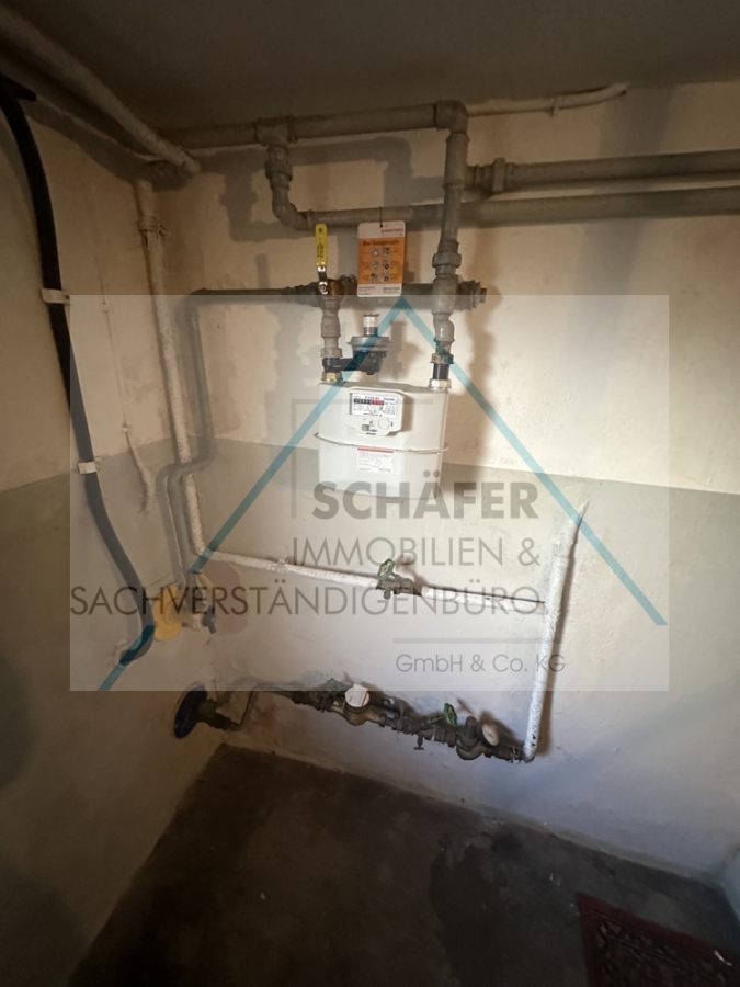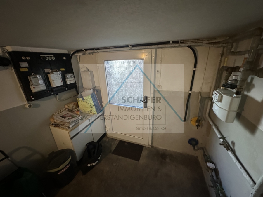 Diese verfügt über ein Wohnzimmer mit Zugang zum Balkon, ein Schlafzimmer sowie eine Küche und ein Badezimmer. Vom Flur aus gelangen Sie über eine Treppe in den Keller. Dort befinden sich eine Waschküche, eine Werkstatt, ein Abstellraum sowie zwei Vorratsräume. Eine Außentür zum Hinterhof und eine Tür mit Außentreppe zur Straße sind ebenfalls vorhanden.