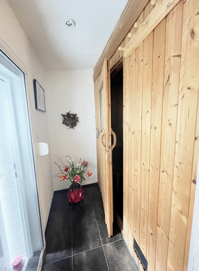 Für Ihre Entspannung ist ebenfalls gesorgt: Im Gäste-WC mit Dusche befindet sich eine Sauna, die Ihnen wohltuende Momente der Ruhe und Erholung schenkt. Ein separater Ausgang führt Sie direkt in den idyllischen Hofgarten, wo Sie frische Luft und Natur genießen können.