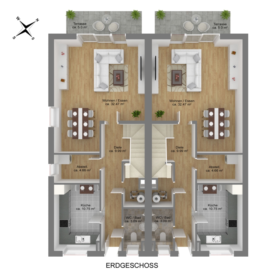 Die Häuser werden in solider, massiver Bauweise errichtet und mit modernster Haustechnik ausgestattet, um den Standard eines KfW-Effizienzhauses 55 zu erreichen. Dies bedeutet für Sie als zukünftige Bewohner nicht nur ein umweltfreundliches Zuhause, sondern auch erfreulich niedrige Nebenkosten. Nachhaltigkeit steht im Mittelpunkt: Jede Einheit wird mit einer effizienten Luft-Wasser-Wärmepumpe für die Fußbodenheizung und Warmwasserversorgung ausgestattet. Eine Photovoltaikanlage liefert umweltfreundlichen Strom für den Eigenverbrauch. Hochwertige Dreischeiben-Wärmeschutzverglasung und elektrische Rollläden runden das energieeffiziente Konzept ab.