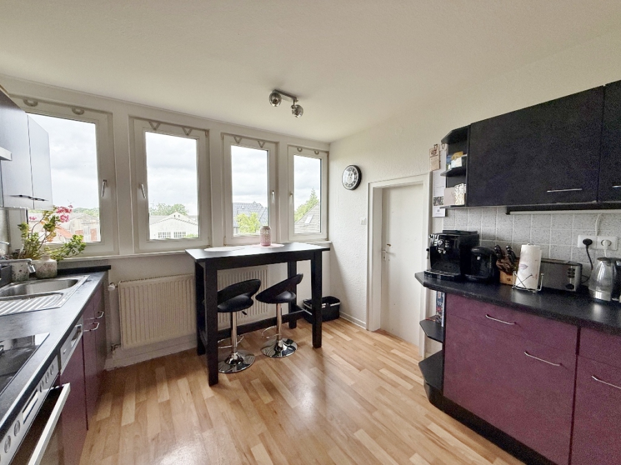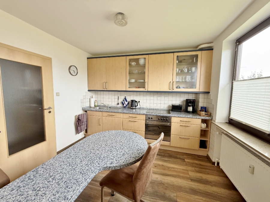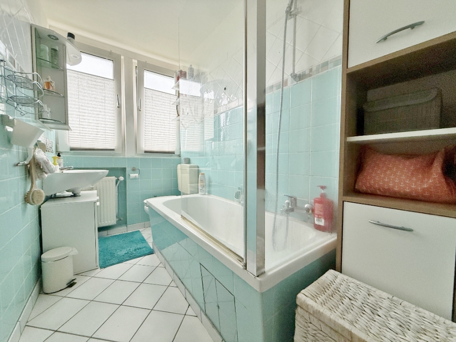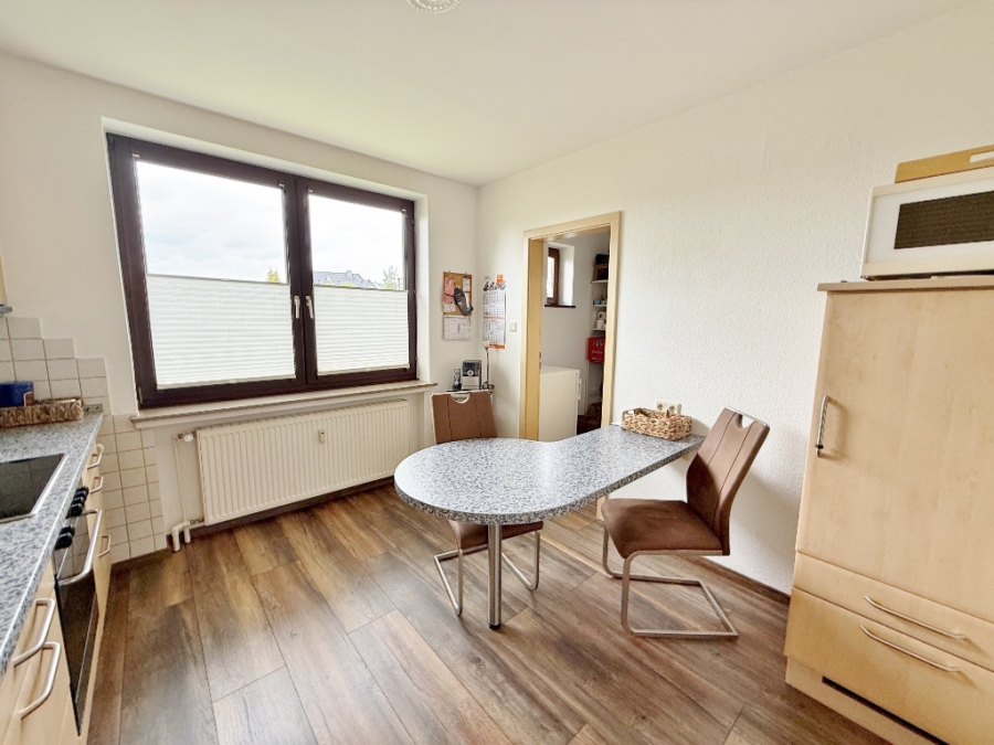 Die OG-Wohnung verfügt über die gleiche Raumaufteilung, einer Einbauküche aus den 1990er Jahren und einem Wannenbad mit blauen Fliesen. Die Wohnräume und der Flur sind mit einem durchgehend verlegten Laminatboden in Holzoptik ausgestattet, sodass ein harmonisches Raumklima entstanden ist.