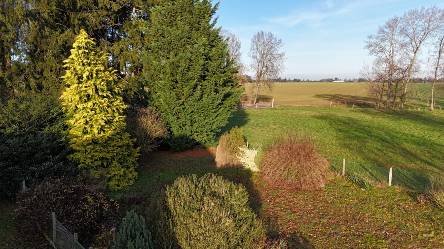 Grundstück: Das Wohnhaus mit Nebengebäuden steht auf einer Gesamtfläche von 2.618 m². Das Grundstück liegt an einer gut frequentierten Durchfahrtsstraße, was die Sichtbarkeit und Erreichbarkeit erhöht – ein möglicher Vorteil für gewerbliche Nutzungskonzepte oder kombinierte Wohn- und Arbeitsprojekte. Gleichzeitig bieten die Größe des Grundstücks und der vorhandene Baumbestand Potenzial für Rückzugsbereiche und geschützte Gartenflächen abseits der Straße. Direkt an der Hofeinfahrt befindet sich eine großzügig angelegte Gartenfläche mit Staudenbeeten als Blickfang.